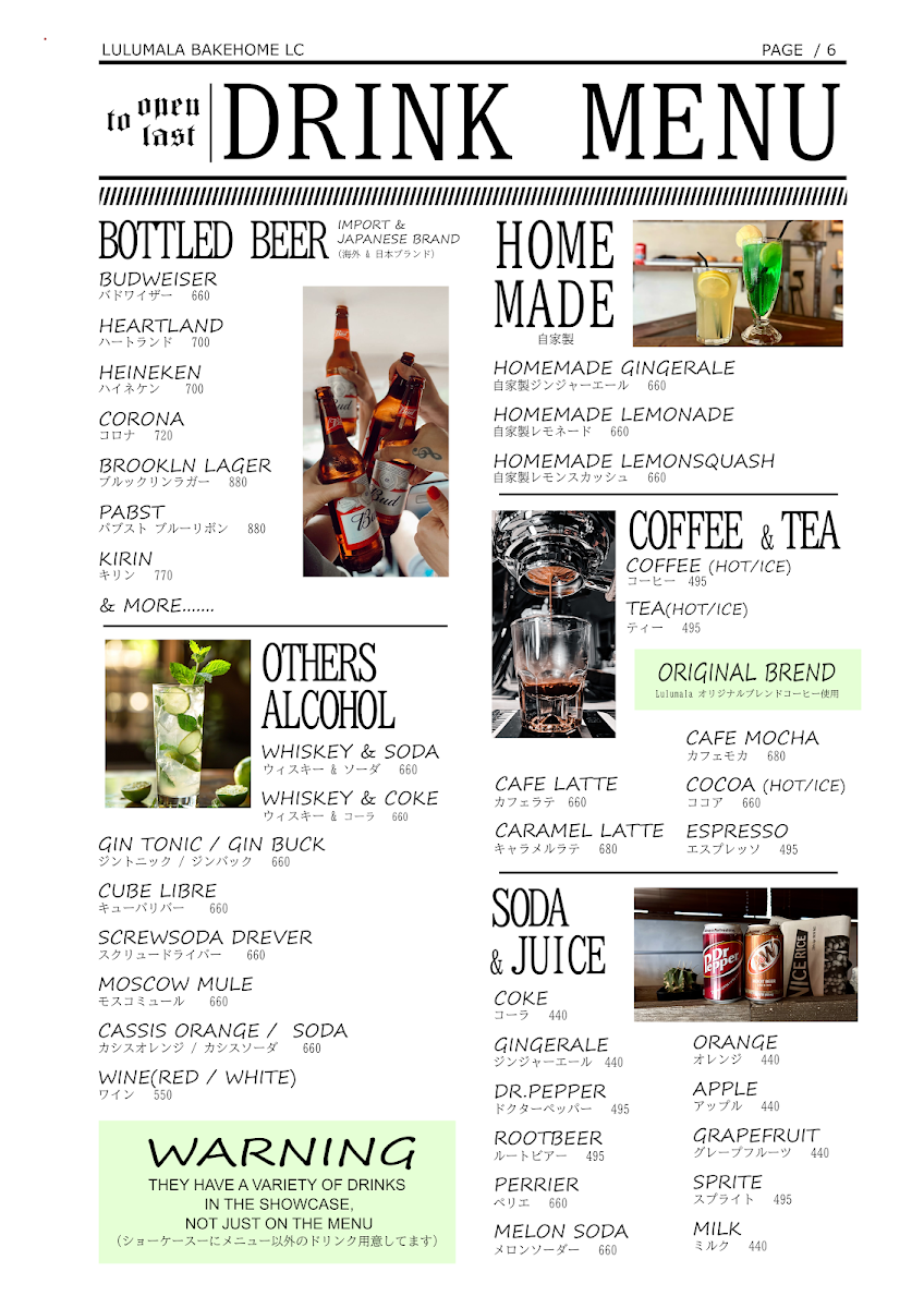 The drinks at Lulumala are equally captivating. Sip on their flavorful Home Made Gingerale (JP¥660), a spiced concoction that adds a zing to your palate. For coffee enthusiasts, don't miss out on their original blend of coffee served hot or iced (JP¥495), or opt for a Cafe Latte (JP¥660) that marries creamy milk with robust coffee—a true sensation.